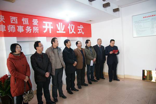 汉台区司法局局长封文武主持开业仪式,市司法局副局长段朝波宣读了省司法厅关于批准设立陕西恒爱律师事务所的批复并为该所授牌,市司法局调研员、市律师协会会长丁毅发表了热情洋溢的讲话,对加强所内管理、完善制度、做大、做强律师事务所、服务汉中“三市”建设提出了希望和要求。