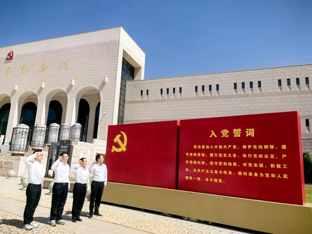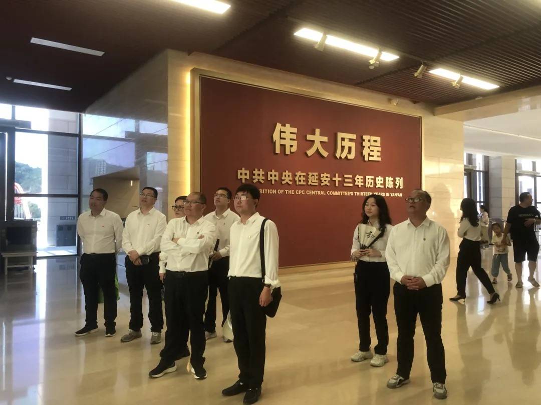 稍后大家统一着装,前往位于王家坪的延安革命纪念馆参观。馆内展室曲槛回廊,馆藏文物丰富多样,形象地展现了党中央在延安十三年波澜壮阔的战斗历程,给每一位参观者的心灵上以极大地震撼。走出展馆已是下午,在宏大的广场上,大家排列在毛主席塑像前合影。之后几位党员集合在鲜红的党旗之下,举起拳头集体重温入党誓词,坚定自己的理想信念。